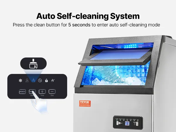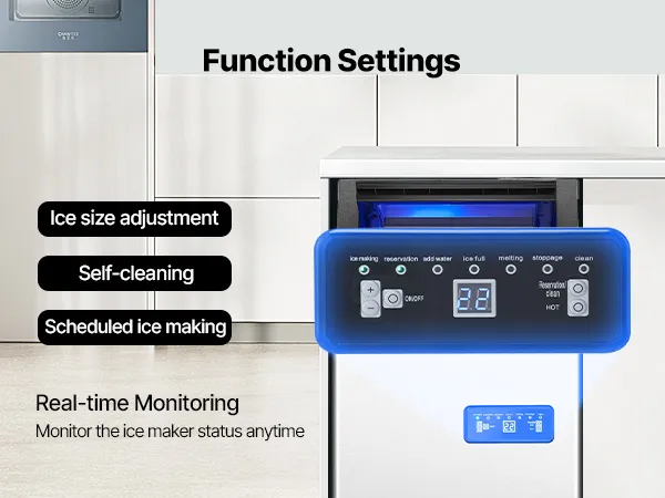 Panel de control inteligente: Nuestra máquina de hielo comercial cuenta con una pantalla digital LED y botones mecánicos que le brindan un control preciso sobre el proceso de fabricación de hielo. Ajuste el grosor del hielo aumentando o disminuyendo el tiempo de fabricación sin esfuerzo. Puede monitorear el estado de la máquina de hielo en tiempo real con la luz indicadora en el panel