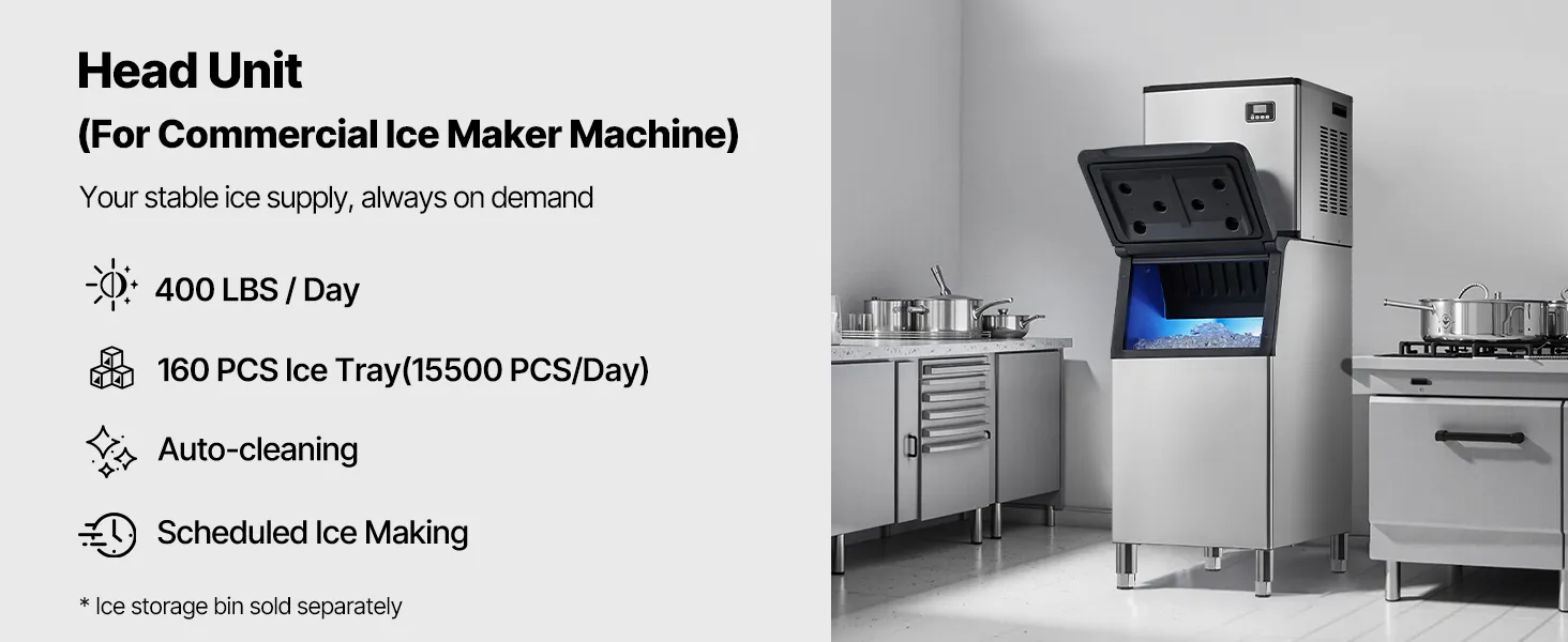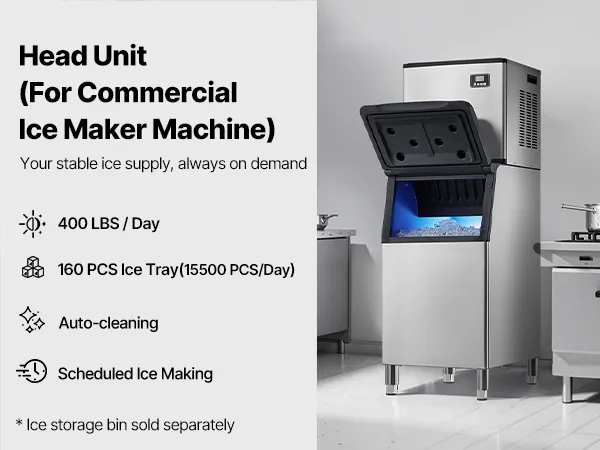 La máquina de hielo comercial cuenta con 160 bandejas de hielo y puede producir 181,4 kg(aproximadamente 15 500 piezas) de hielo cada 24 horas, lo que garantiza un suministro continuo de hielo.