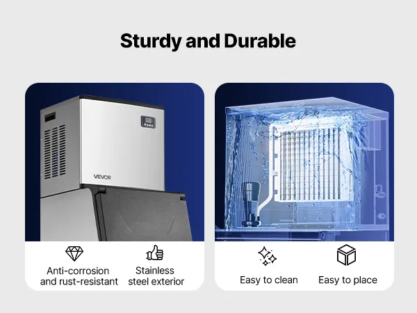 La máquina para fabricar hielo comercial cuenta con una carcasa de acero inoxidable refinada, que es resistente al óxido y la corrosión, fácil de limpiar y muy duradera.