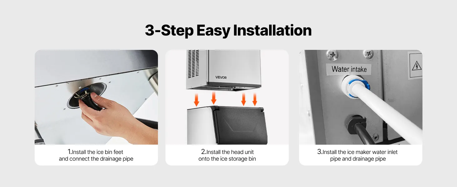 La máquina para fabricar hielo es fácil de instalar y el diseño de drenaje por gravedad garantiza una descarga de agua rápida y eficiente.