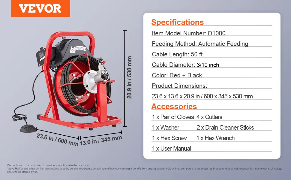 Deje que la máquina limpiadora de desagües eléctrica VEVOR con cable de núcleo sólido de 15 m x 7,62 mm resuelva todos los problemas de obstrucción de una sola vez y sin problemas.