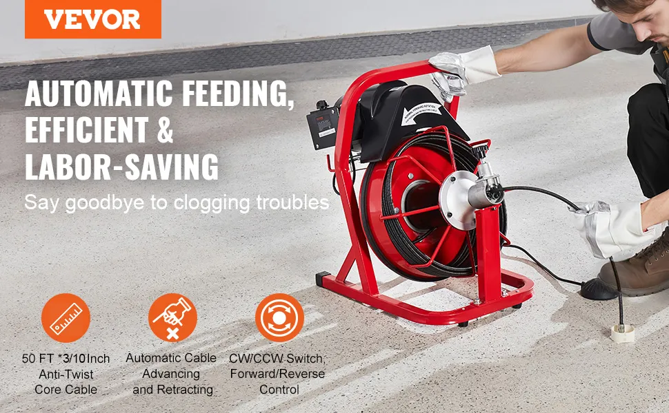 Afronte las obstrucciones rebeldes: La máquina limpiadora de drenajes VEVOR cuenta con un sistema de control de alimentación automático para introducir y sacar el cable de las tuberías de drenaje. Actualizado con control CW/CCW y pedal neumático, la gestión de cables se vuelve más fácil.