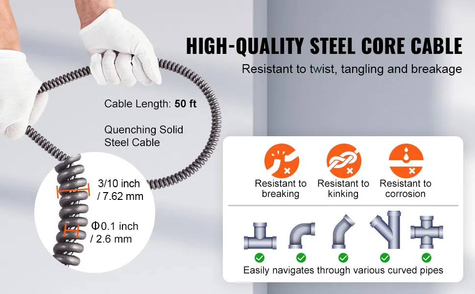 Cable con núcleo de acero premium: Nuestro cable con núcleo de acero de 15 m x 7,62 mm presenta una resistencia superior a roturas, torsiones y corrosión. Navega suavemente por tuberías curvas complejas de entre 5 y 10 cm, lo que garantiza un rendimiento confiable en trabajos difíciles.