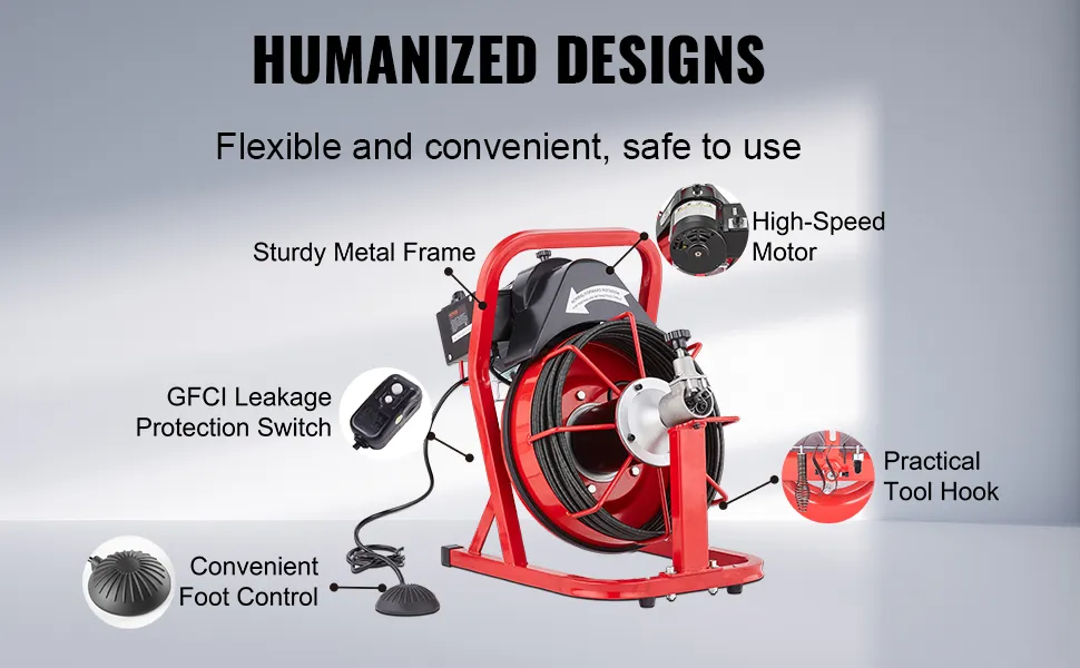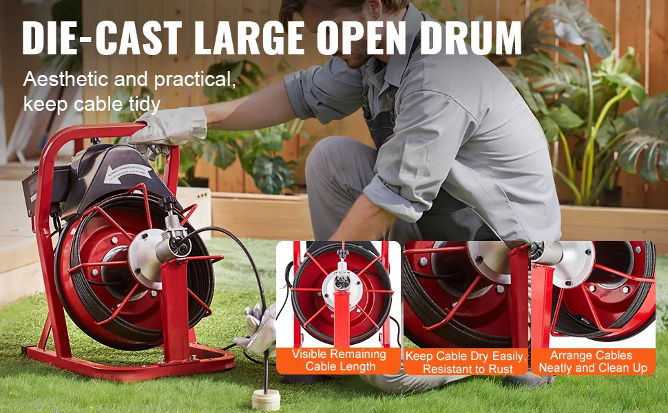 Práctico diseño de carcasa abierta: El sinfín de drenaje de alcantarillado cuenta con un tambor de carcasa abierta para una fácil limpieza y mantenimiento, lo que permite monitorear en tiempo real la longitud del cable. También incluye un interruptor GFCI para seguridad y ganchos para herramientas para un almacenamiento conveniente del cortador de cables.