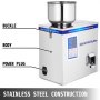 La gran tolva permite que la llenadora trabaje de forma continua y eficiente. Fabricada en acero inoxidable, material apto para uso alimentario, con un perfecto tratamiento superficial, la tolva es digna de ser utilizada. Capacidad de 200 g.