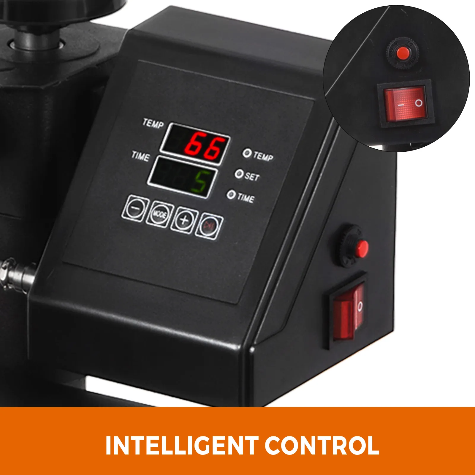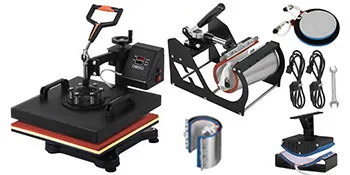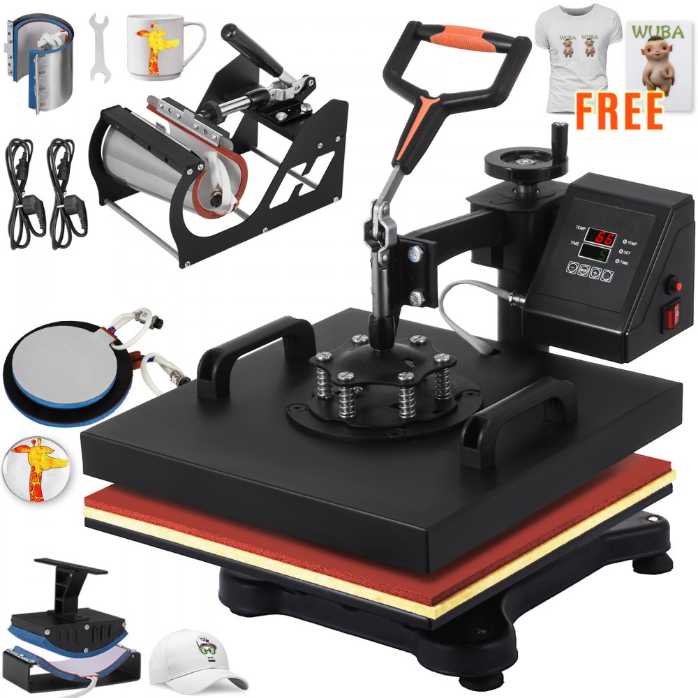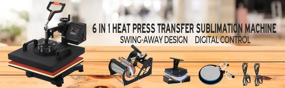 This 6 in 1 heat press printer with varieties of fittings, including one platen press (Teflon-coated), one hat/cap press, two mug presses and two plate presses, allows patterns transfer onto T-shirts, caps, mugs, plates, ceramic tiles, and other flat surfaced items.