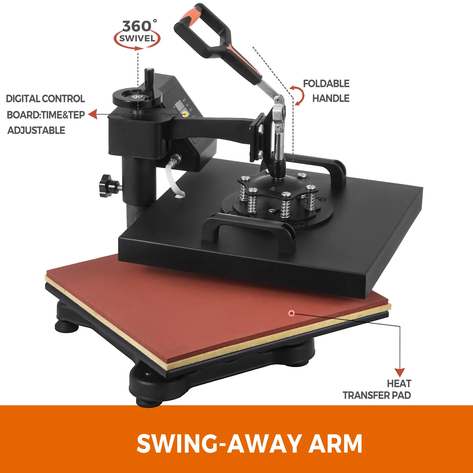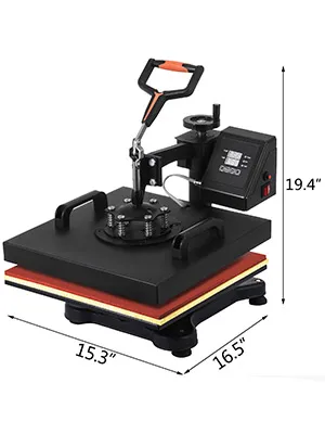This 6 in 1 swing-away heat press boasts all of the must-have attachments. The hi-tech microprocessor program ensures you get the finest graphics on your T-shirts, caps, hats, plates, mugs and so on. Besides you will not worry at all about safety problem due to our dual safety protection. You will absolutely have fun with this machine!