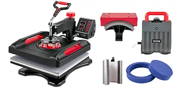 Esta máquina de impresión de camisetas tiene una variedad de accesorios, que incluyen una prensa de platina, una prensa de sombreros / gorras, una prensa de tazas, una prensa de ollas de aluminio y dos prensas de placas, lo que permite que los patrones se transfieran a camisetas, gorras, tazas, platos y otros elementos de superficie plana.