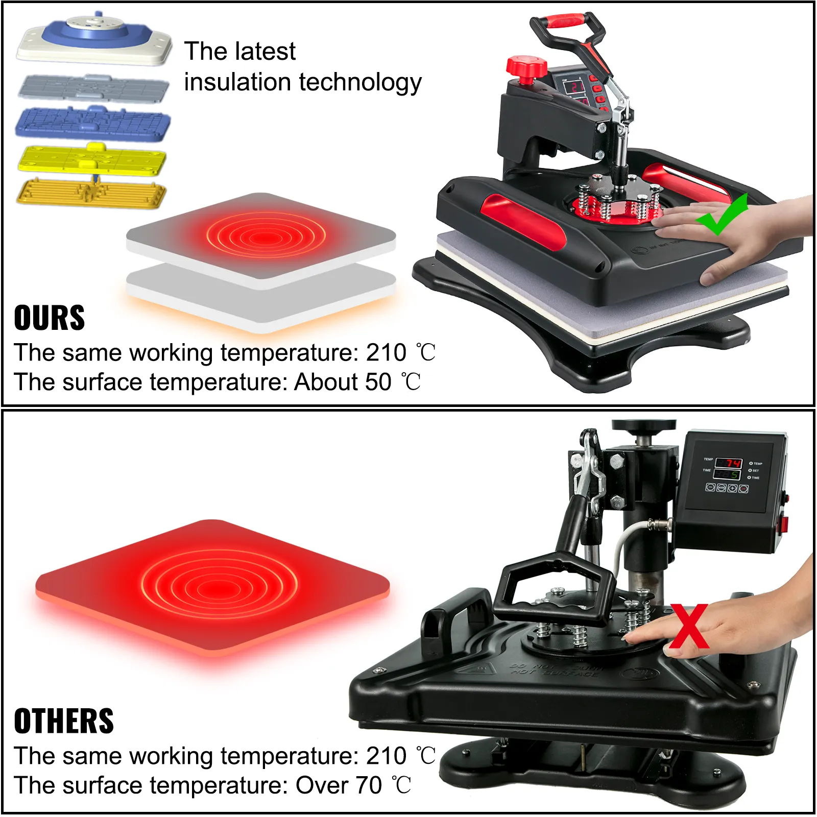 La última tecnología de aislamiento de dos capas garantiza que la temperatura de la superficie de la prensa térmica de sublimación sea de solo 50 ℃ cuando la temperatura de trabajo alcance los 210 ℃.