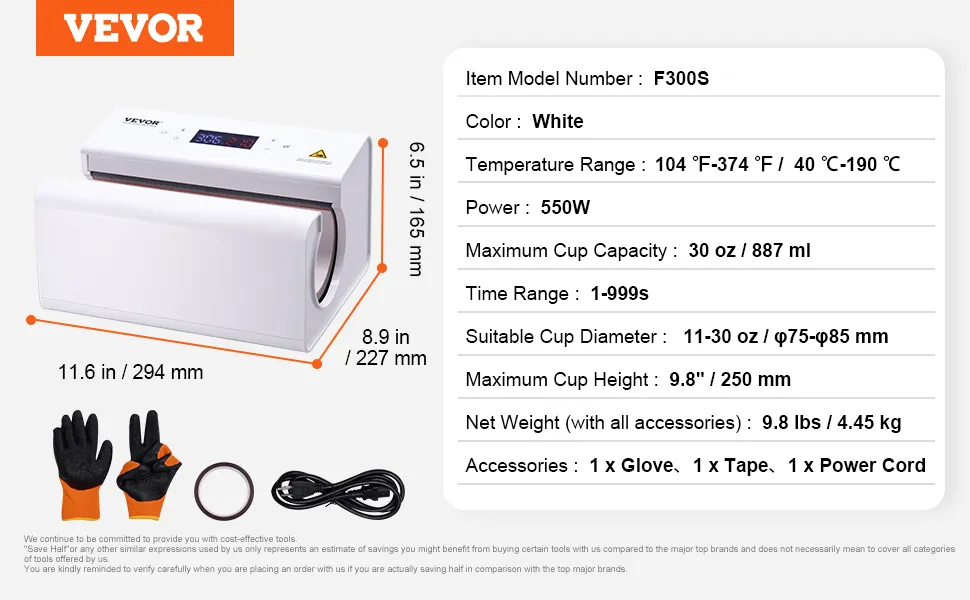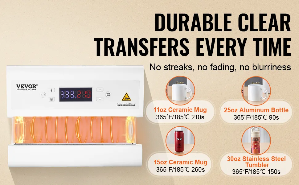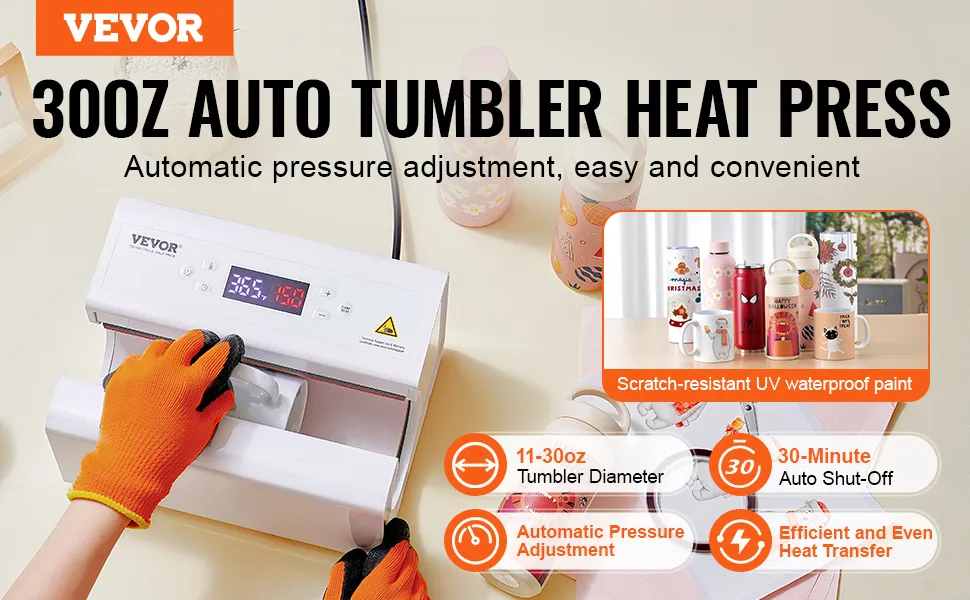 VEVOR - Prensa térmica automática para vasos de 11 a 30 oz, se calienta de manera rápida y uniforme, con cinta y guante, ajuste de temperatura y tiempo, para vasos, tazas y tazones, color blanco
