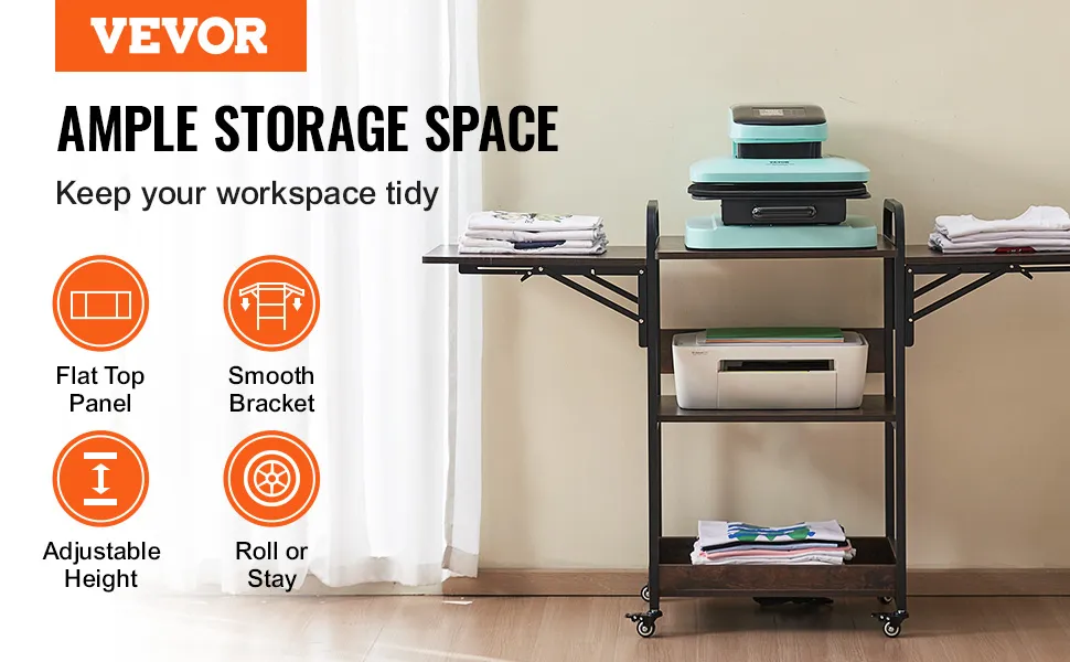 Almacenamiento de tres niveles: organice sus suministros con un espacio de almacenamiento exclusivo para máquinas de prensado térmico, cortadores, impresoras, materiales y accesorios. Nuestra mesa de prensado térmico mantendrá su espacio de trabajo ordenado y atractivo a la vista.