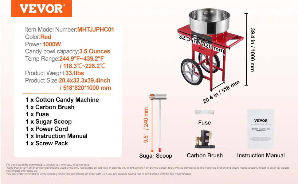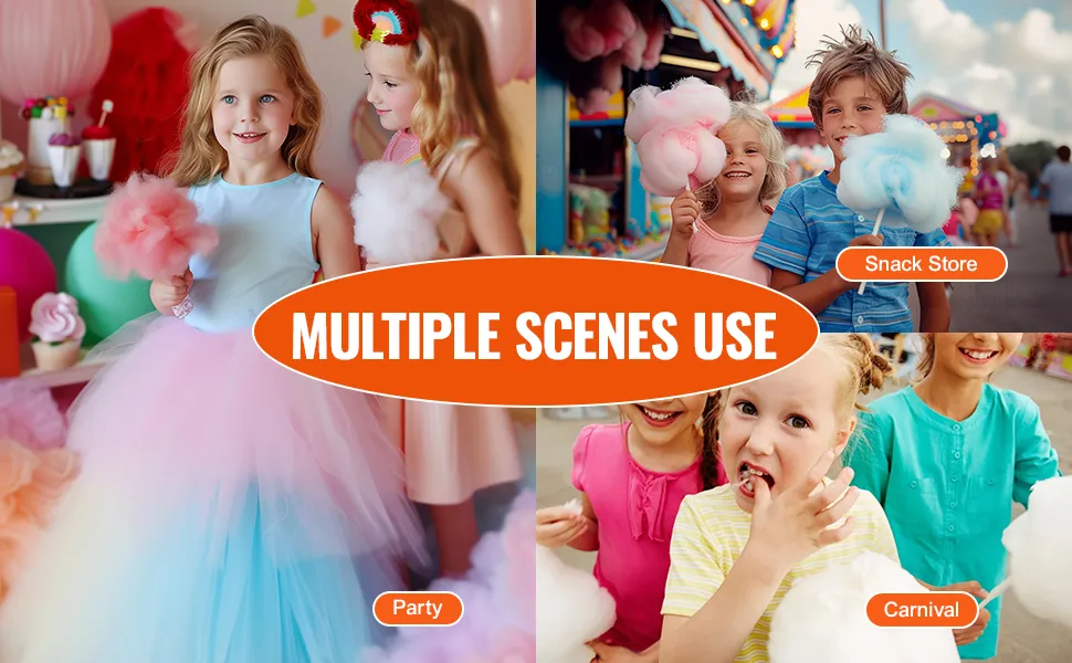 Trabaje con cualquier caramelo que desee: esta máquina de algodón le permite utilizar los tradicionales azúcares de hilo dental, azúcares de leche, cubitos de fruta o cualquiera de sus caramelos duros favoritos para hacer deliciosos caramelos de algodón. Las ruedas grandes y el asa resistente facilitan el movimiento y es perfecto para carnavales, festivales, fiestas de cumpleaños y eventos deportivos.