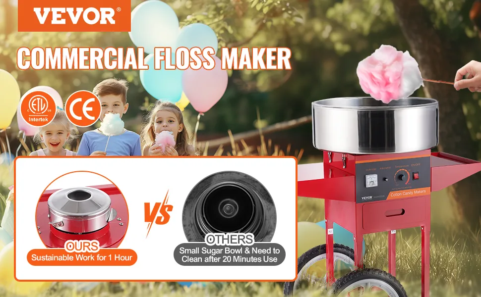 Diseños fáciles de usar: esta máquina para hacer algodón de azúcar está equipada con una caja de dulces, que ayuda a proporcionar espacio de almacenamiento adicional para conos/palitos de algodón de azúcar o paquetes de azúcar con hilo dental; La cuchara de azúcar como ofrenda adicional es conveniente para que usted saque y vierta el azúcar; Los componentes del tratamiento de sellado pueden evitar que los copos de azúcar caigan en los huecos. Además, la certificación ETL/CE garantiza una mayor seguridad durante el uso.