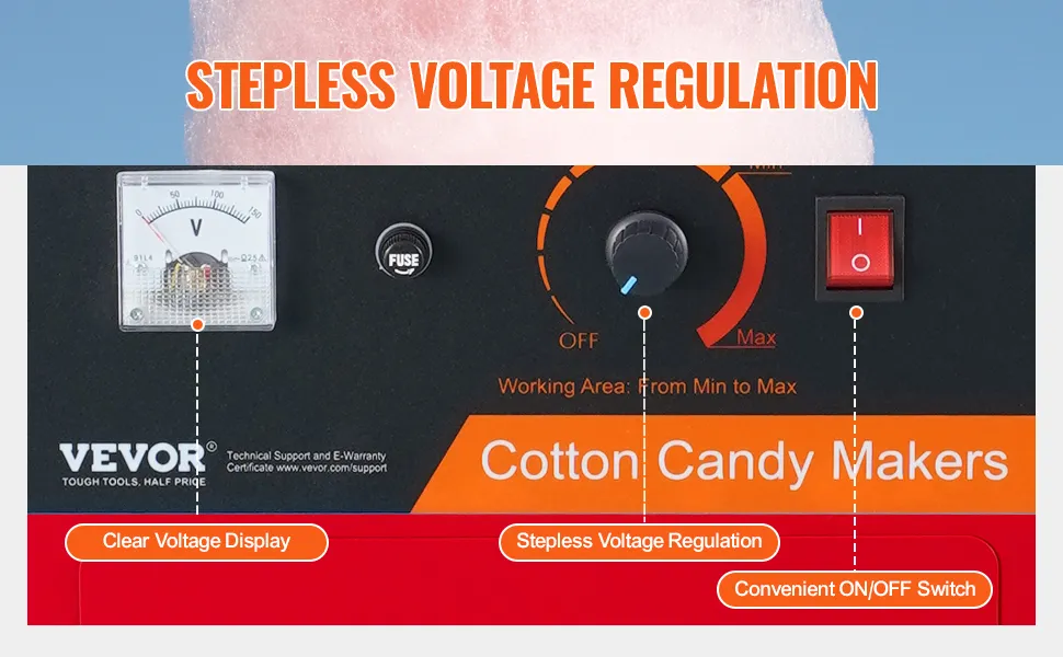 Control de temperatura: a diferencia de las comunes, nuestra máquina eléctrica para hacer algodón de azúcar cuenta con un medidor de voltaje y una perilla de control de temperatura. Al cambiar el voltaje, puede simplemente ajustar la temperatura de 244,9 °F/118,3 ℃ a 439,2 °F/226,2 ℃. Si quieres probar azúcares de diferentes sabores, definitivamente lo necesitarás.