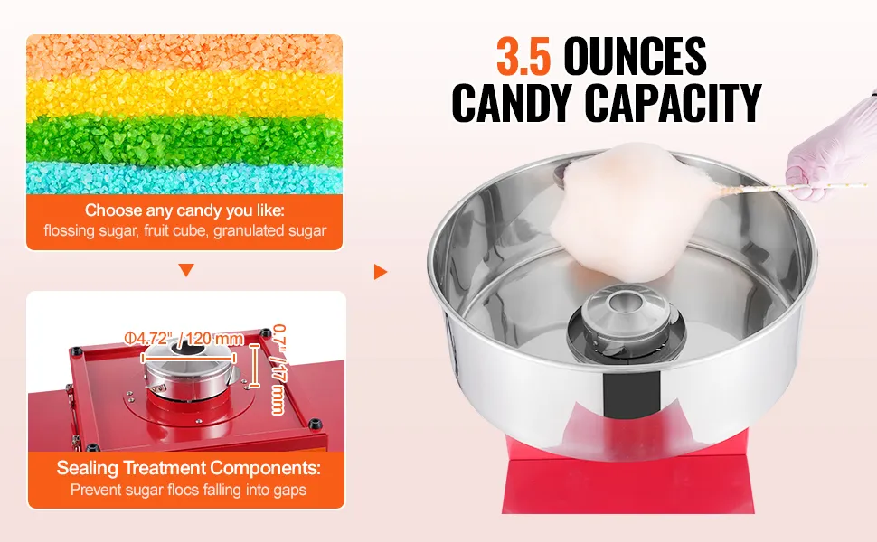 Esta máquina para fabricar algodón de azúcar tiene un motor de 1000 W y un recipiente para dulces más grande que proporciona aproximadamente 6 algodones de azúcar por minuto. Esta máquina para hacer algodón de azúcar puede funcionar de forma continua durante una hora.