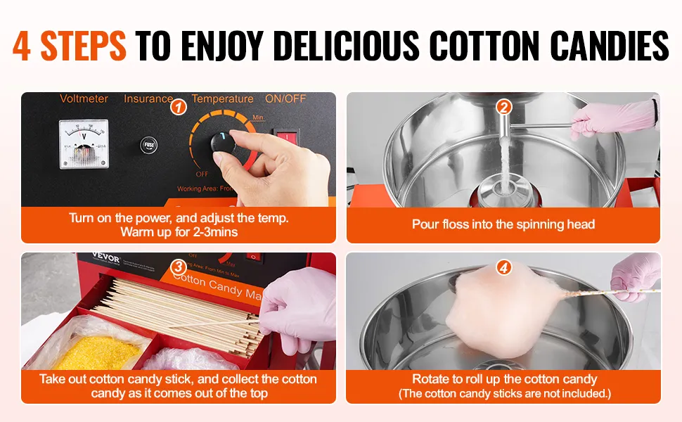Proceso de funcionamiento sencillo: utilizar esta máquina no podría ser más sencillo. Encienda la alimentación, ajuste la temperatura, caliente durante 2-3 minutos y vierta azúcar en el cabezal giratorio, y luego solo tendrá que usar los palos para recoger el algodón de azúcar del cabezal.