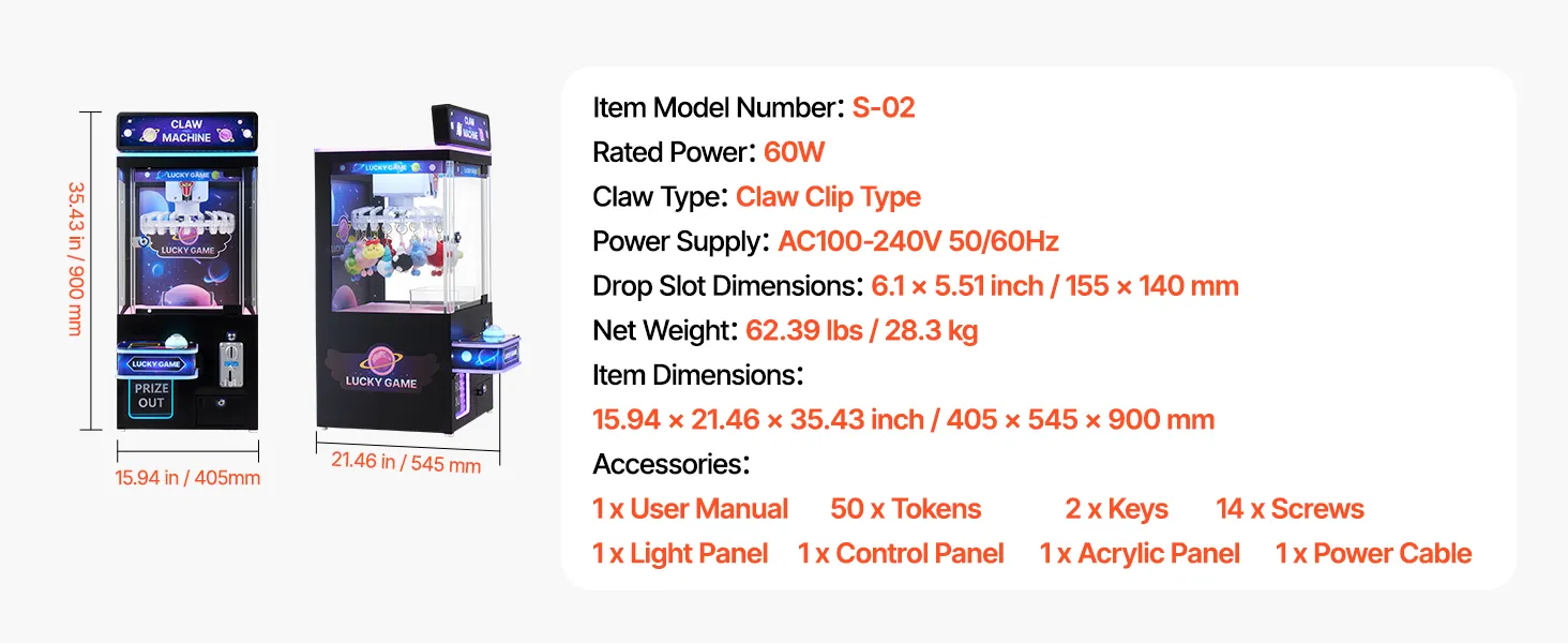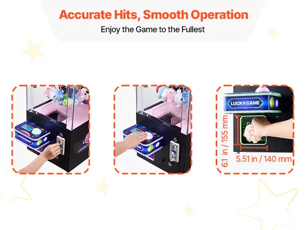Mecánica de juego sencilla e intuitiva: Inserta de 1 a 15 monedas para empezar. La máquina de garras incluye 50 fichas, un joystick preciso y una pantalla nítida, lo que facilita su manejo a jugadores de todas las edades