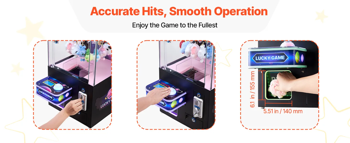 Dificultad ajustable: Esta máquina de agarrar juguetes cuenta con un modo de agarre con pinza y probabilidad de captura ajustable, ideal para objetos de hasta 50 g como accesorios, peluches o cartas. Sus controles suaves y precisos hacen que cada partida sea divertida, aunque se requiere cierta habilidad para atrapar cada juguete
