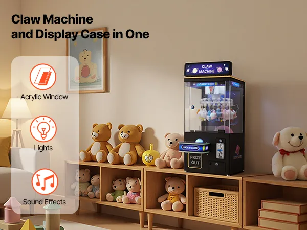 La máquina de garras cuenta con una ventana de acrílico transparente para exhibir objetos coleccionables, luces brillantes para realzar el ambiente y efectos de sonido dinámicos durante el juego, ofreciendo entretenimiento y funcionalidad de exhibición en una sola unidad.