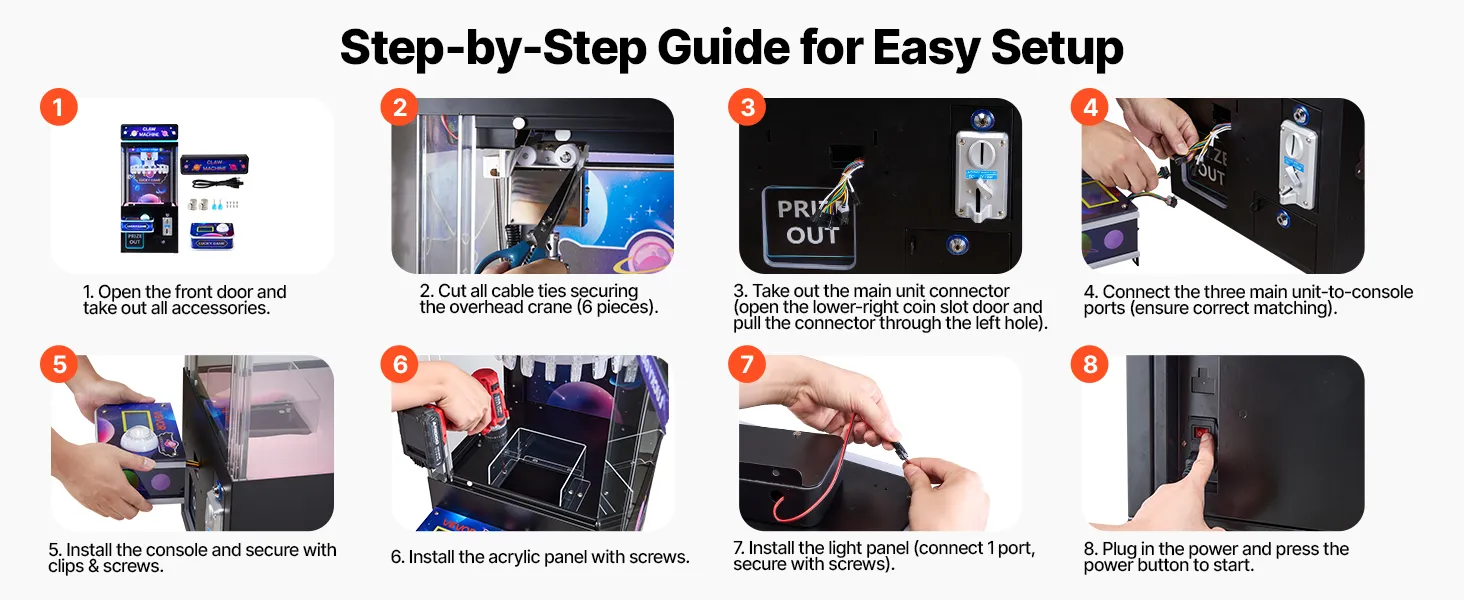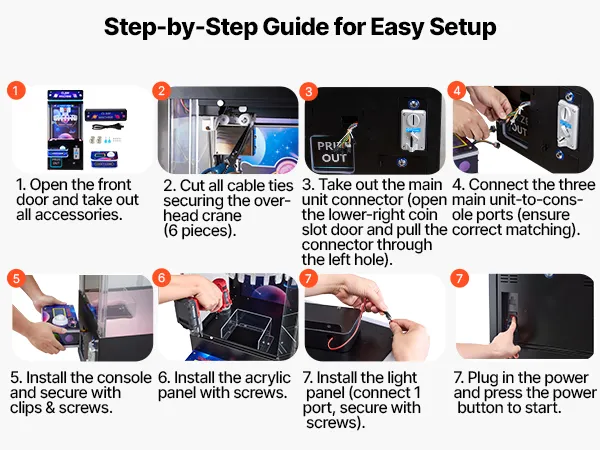 La máquina de garras viene con un manual de instrucciones detallado y todas las piezas necesarias, lo que permite incluso a los principiantes montarla rápidamente y disfrutar de una diversión sin fin.