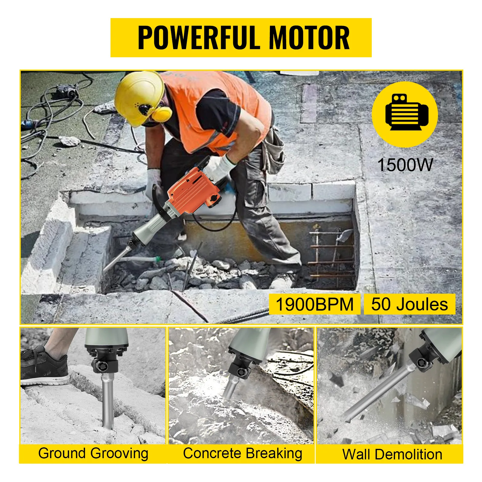 El motor de cobre puro viene con una fuerte potencia de 1500 vatios que proporciona 1,900 golpes de impacto por minuto para romper fácilmente el hormigón, el ladrillo, el suelo y la tierra. La alta capacidad de carga y la mayor eficiencia también significan una mayor productividad.