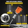 Hay 3 cinceles, todos forjados con acero de aleación de primera calidad tratado térmicamente. El mandril hexagonal de 1-1/8 " puede ensamblar y desmontar rápidamente los cinceles sin que se caigan accidentalmente.