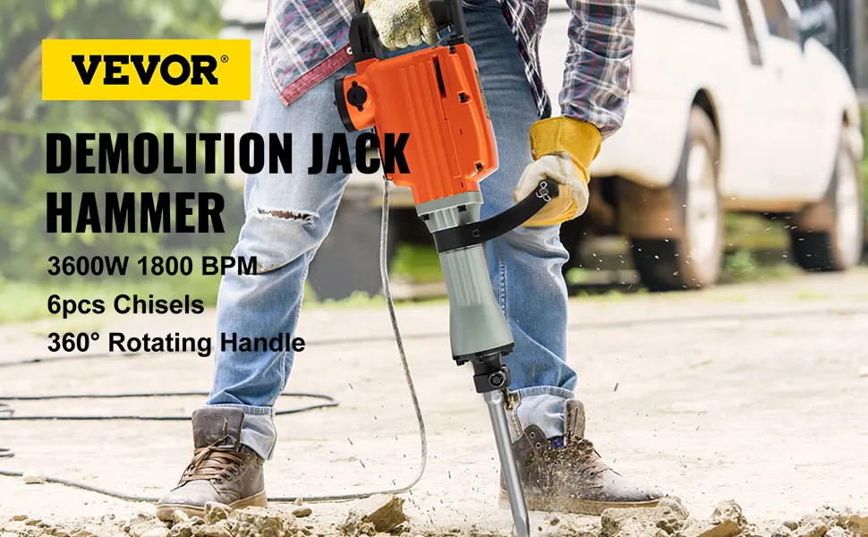 Nuestro martillo de demolición eléctrico de 3600 W con empuñadura delantera ajustable de 360 ° proporciona control y comodidad adicionales durante un uso prolongado. Se caracteriza por una construcción resistente con grado industrial para una alta durabilidad. Además, tiene 6 cinceles para múltiples funciones y un mango en forma de D para absorber las vibraciones y reducir la fatiga del operador.