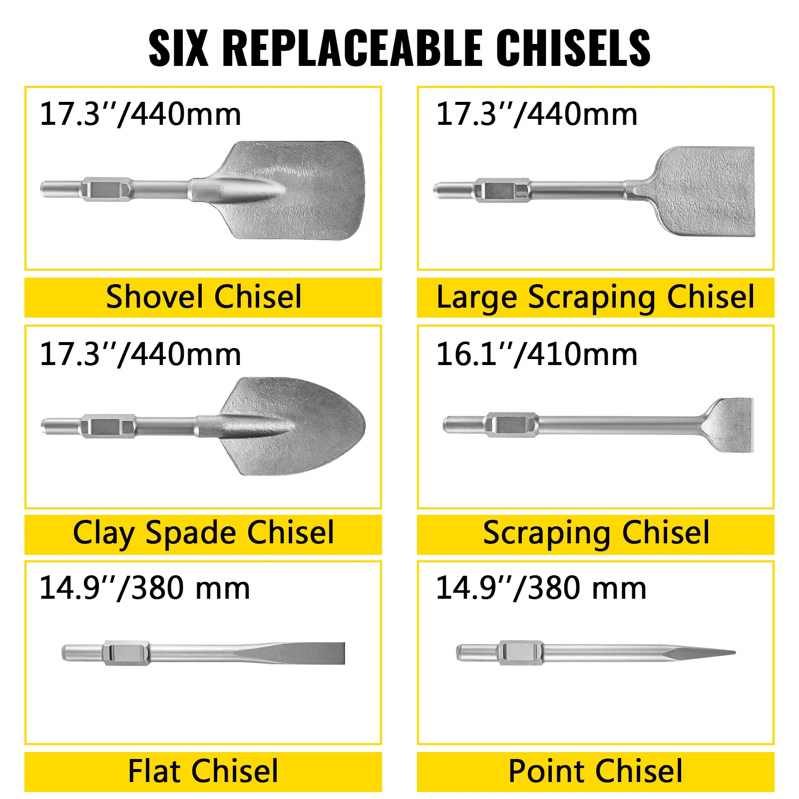 Hay 6 cinceles en el paquete. Todos están forjados con acero de aleación de calidad tratado térmicamente. El mandril hexagonal presenta un montaje y desmontaje rápido. Es fácil para usted reemplazar el cincel que nunca se caerá accidentalmente después de sujetarlo.