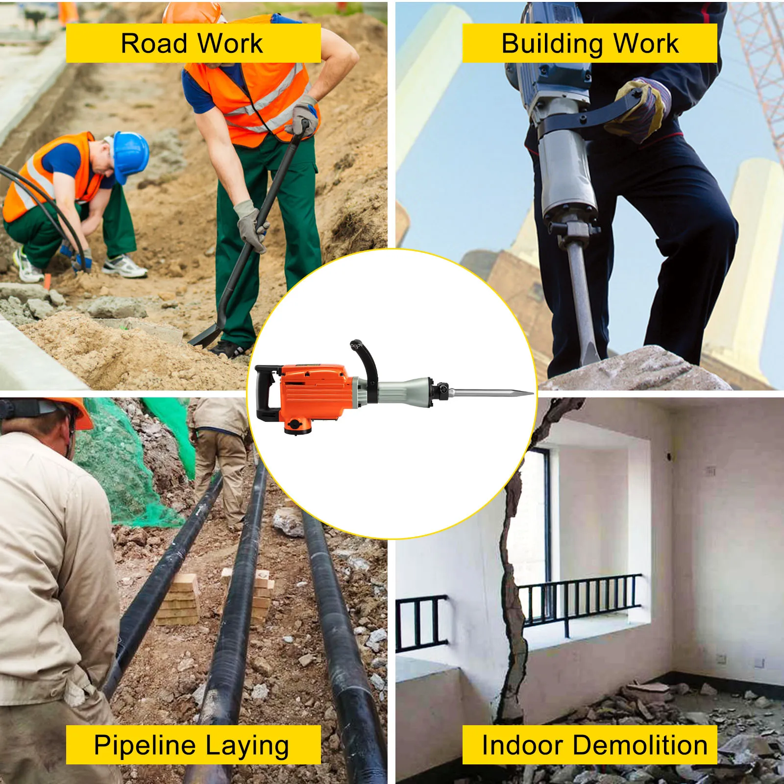 El martillo neumático es una herramienta ideal para demolición, excavación de zanjas, astillado, rotura de agujeros en hormigón, bloques, ladrillos, estuco de baldosas, etc. Es muy adecuado para fontanería, instalación mecánica, construcción de instalaciones de suministro de agua y drenaje, decoración de interiores, instalaciones portuarias y otros proyectos de construcción.