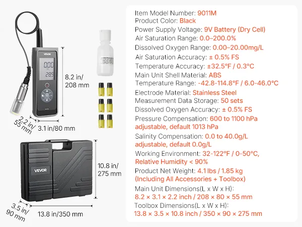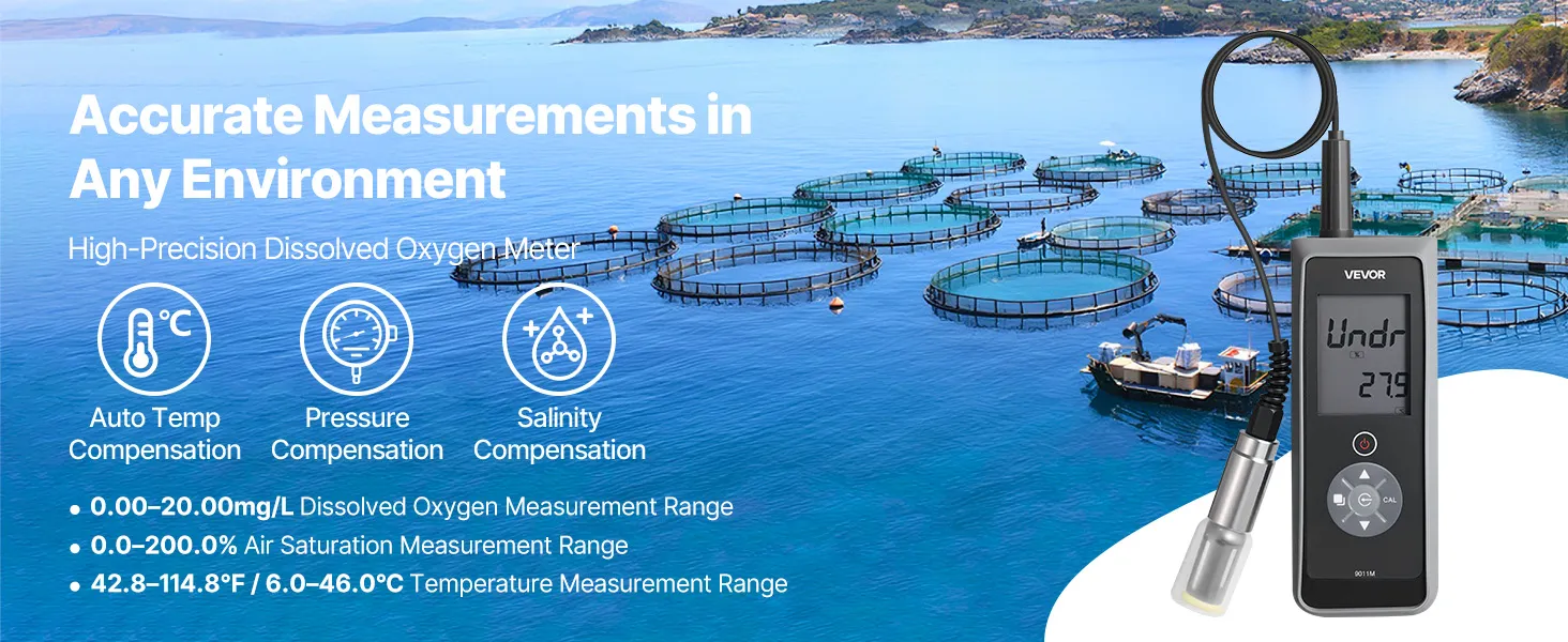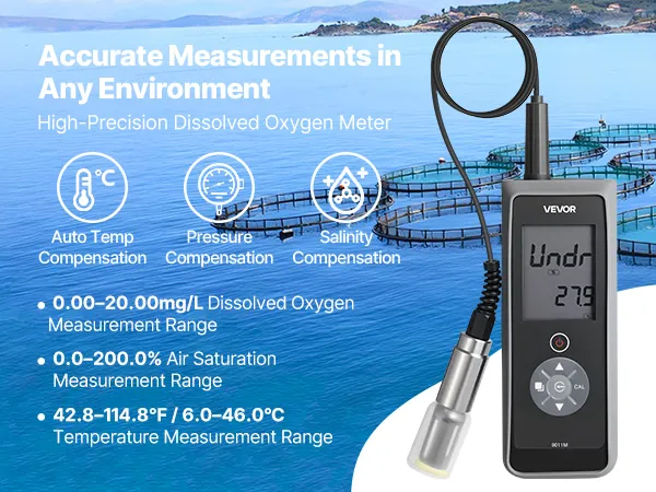 Alta precisión: Nuestro medidor de oxígeno disuelto cuenta con compensación automática de temperatura, presión manual y salinidad, lo que garantiza resultados precisos en diversas condiciones de agua. Precisión: ±0,5 % FS para oxígeno disuelto/saturación y ±32,5 °F para temperatura
