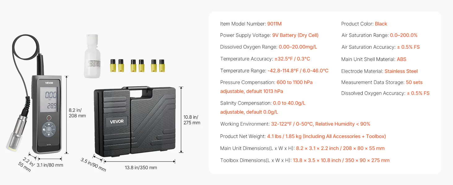 VEVOR Medidor de Oxígeno Disuelto, Rango de Dedición de 0,00–20,00 mg/L, Kit Portátil de Prueba de Oxígeno Disuelto con Cable de Electrodo de 4 m, Juego de Membranas y Estuche de Transporte
