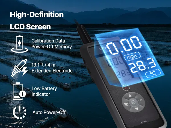 La pantalla LCD ultranítida permite una lectura fácil y sin reflejos. Incluso bajo la luz solar directa, la pantalla del medidor de oxígeno disuelto se mantiene brillante y legible, proporcionando lecturas precisas cuando las necesita.