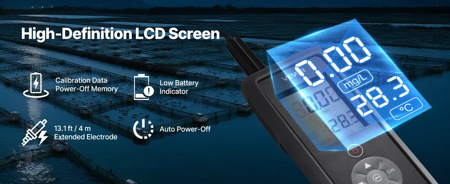 Pantalla de fácil lectura: Rango de medición: Oxígeno disuelto: 0,00-20,00 mg/L, Saturación del aire: 0,0-200,0 %, Temperatura: -42,8 a 114,8 °F. Este medidor de oxígeno disuelto ofrece una pantalla nítida y antirreflejos para una fácil lectura de datos, incluso con luz solar intensa