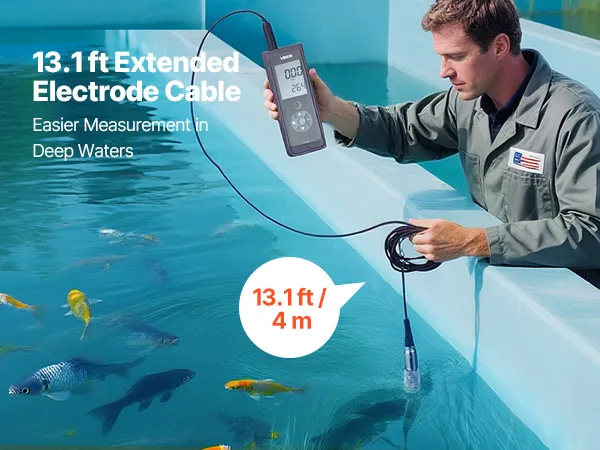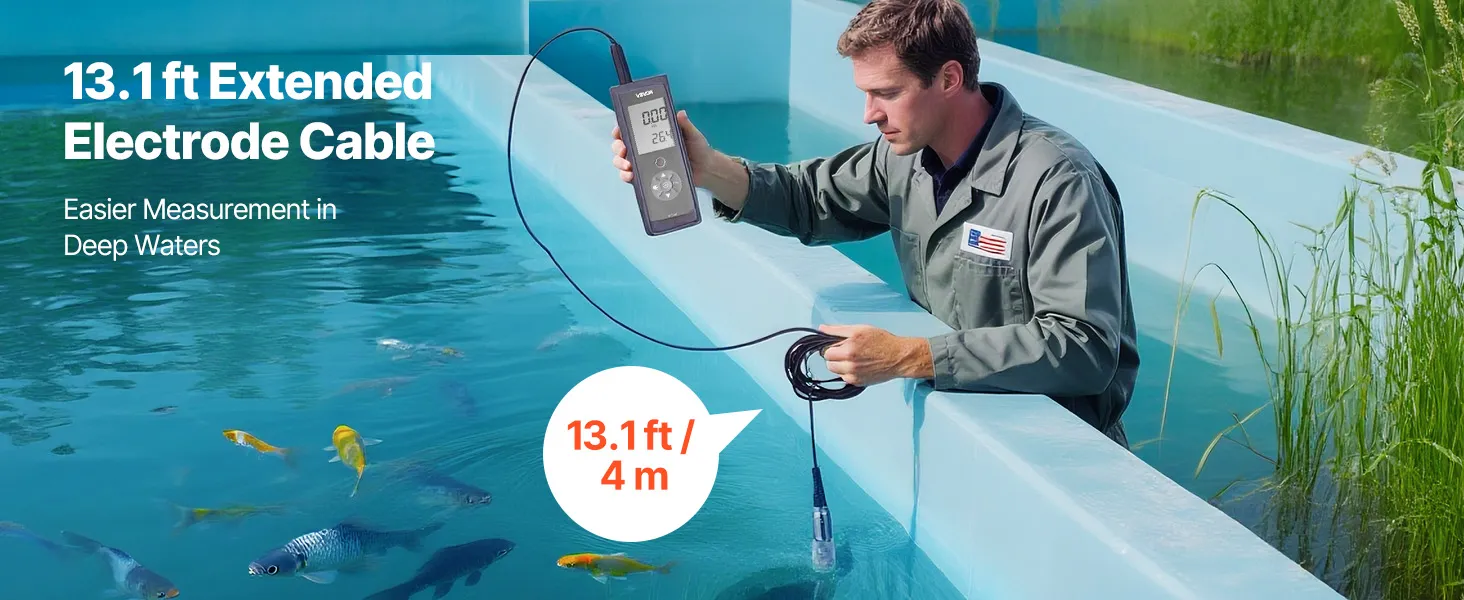 El electrodo de 4 m de largo alcanza fácilmente estanques profundos, pozos o grandes tanques de agua. Nuestro medidor de oxígeno disuelto simplifica el trabajo de campo y le permite recopilar datos precisos con facilidad.