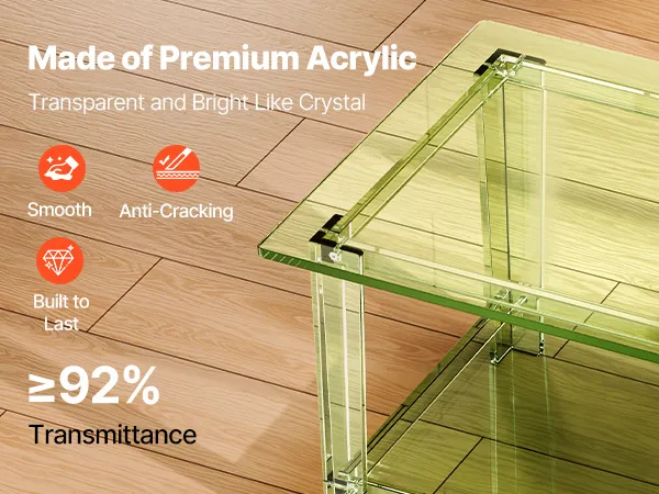 Material acrílico: Fabricada con acrílico de alta calidad, esta mesa auxiliar acrílica tiene una superficie cristalina que se mantiene brillante con el tiempo. Más resistente a los impactos que el vidrio templado, es una opción segura y robusta, especialmente para hogares con niños y mascotas