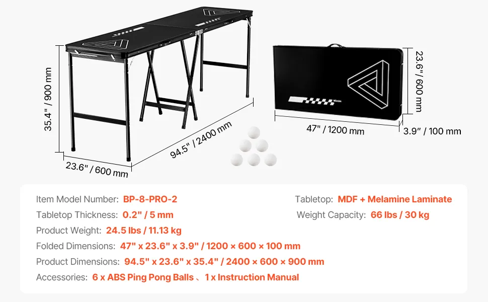 VEVOR Mesa de Juego de Beer Pong 240 x 60 x 90 cm Mesa Elevada Portátil y Plegable con Asas de Transporte 6 Pelotas de Ping Pong Mesa Ligera para Portón Trasero para Fiestas, Viajes, Campamentos
