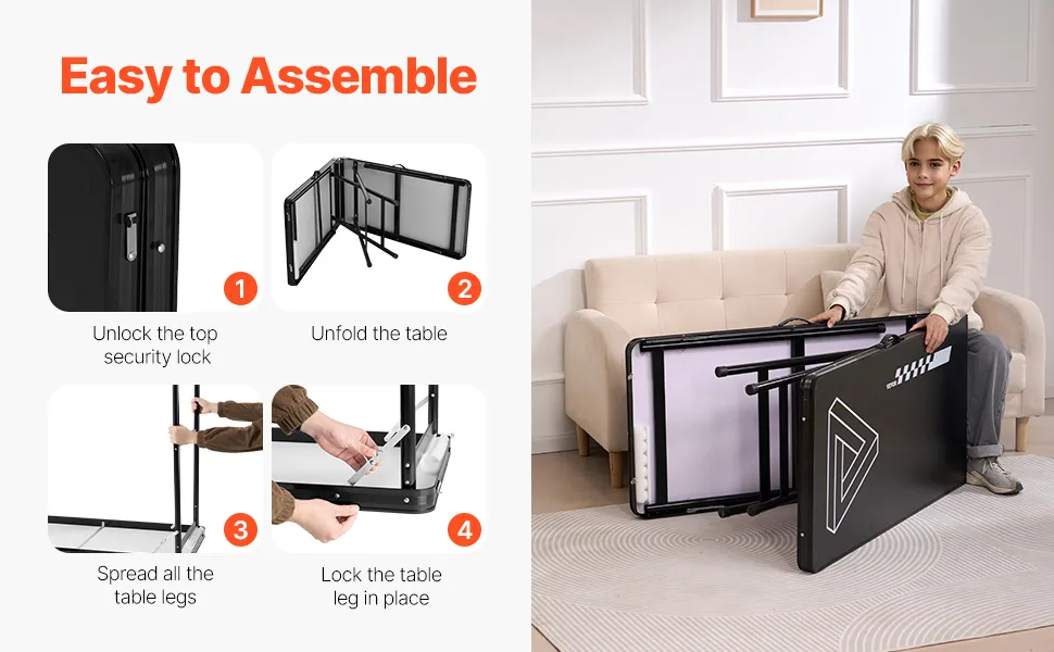 Diseño multifuncional: Esta mesa de beer pong plegable presenta un diseño multifuncional que combina un marco de aluminio resistente con una superficie de MDF duradera para garantizar la estabilidad y la confiabilidad. Equipada con un mecanismo de bloqueo de seguridad, ofrece un juego seguro