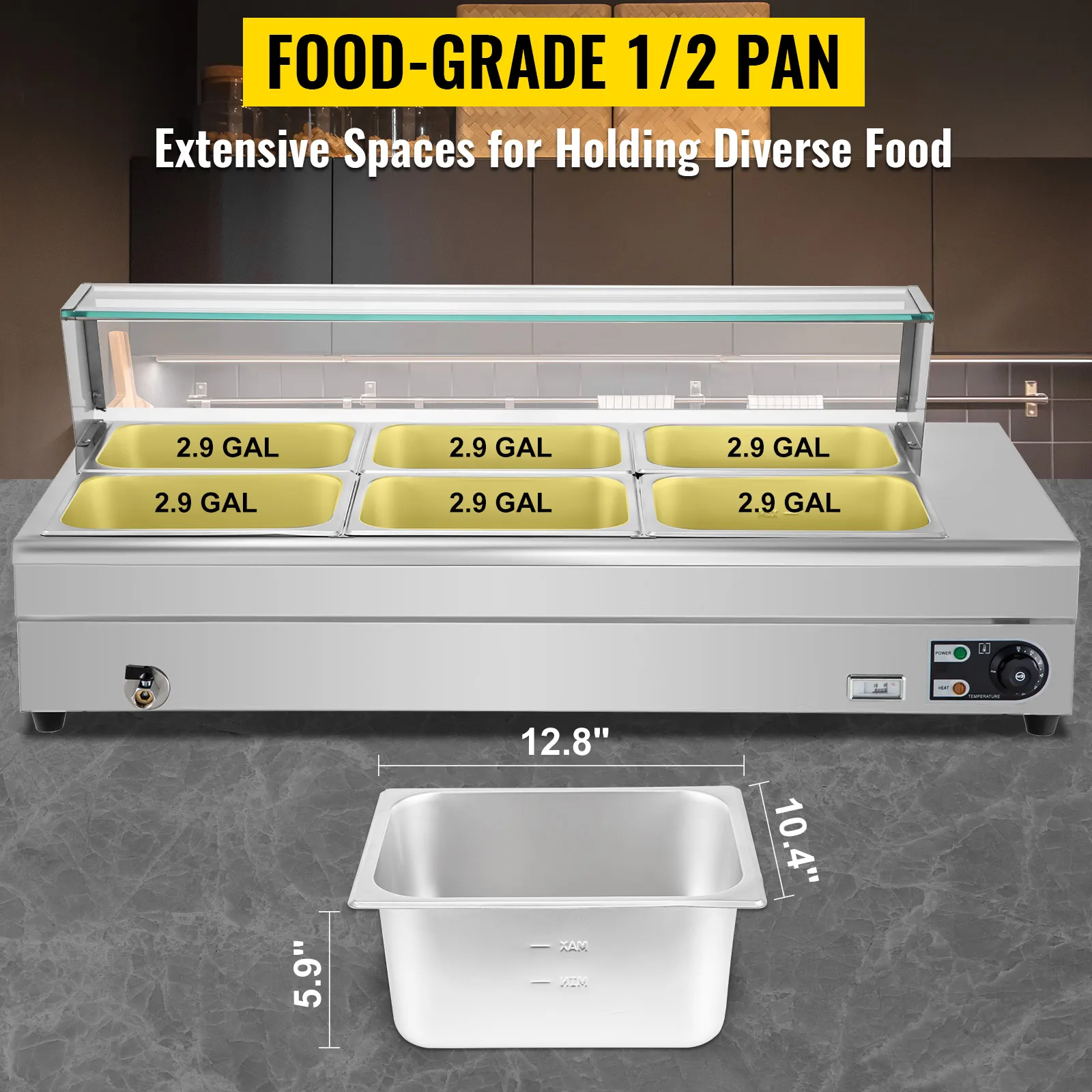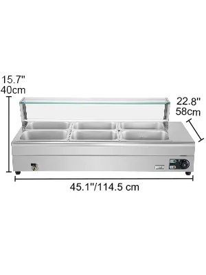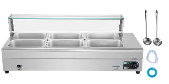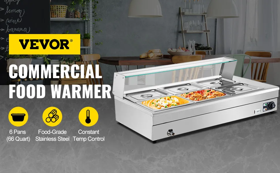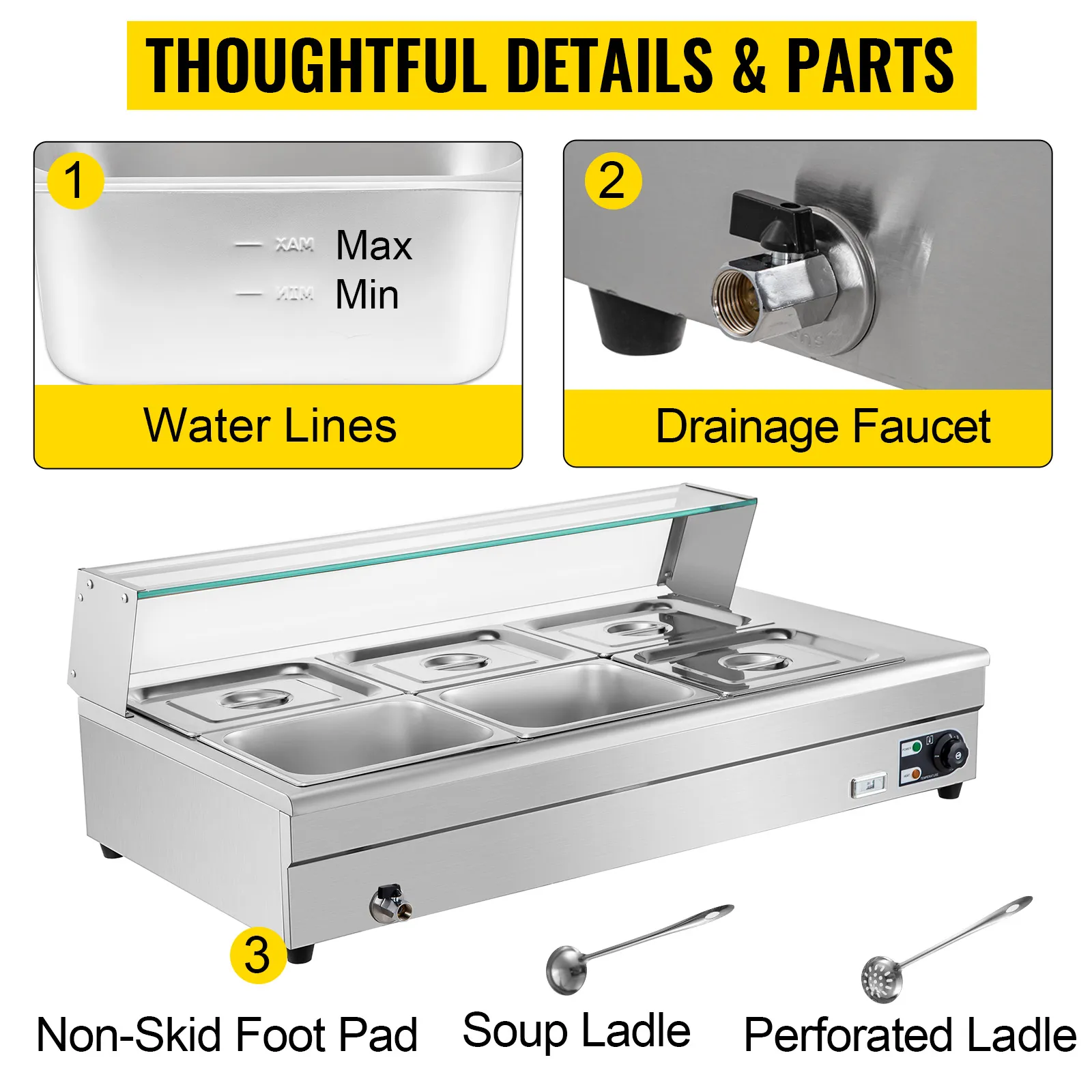 Este calentador de alimentos comercial está equipado con un grifo de drenaje para escurrir fácilmente el exceso de agua. Cada bandeja de comida tiene una tapa de acero inoxidable para evitar que el polvo entre en la comida.