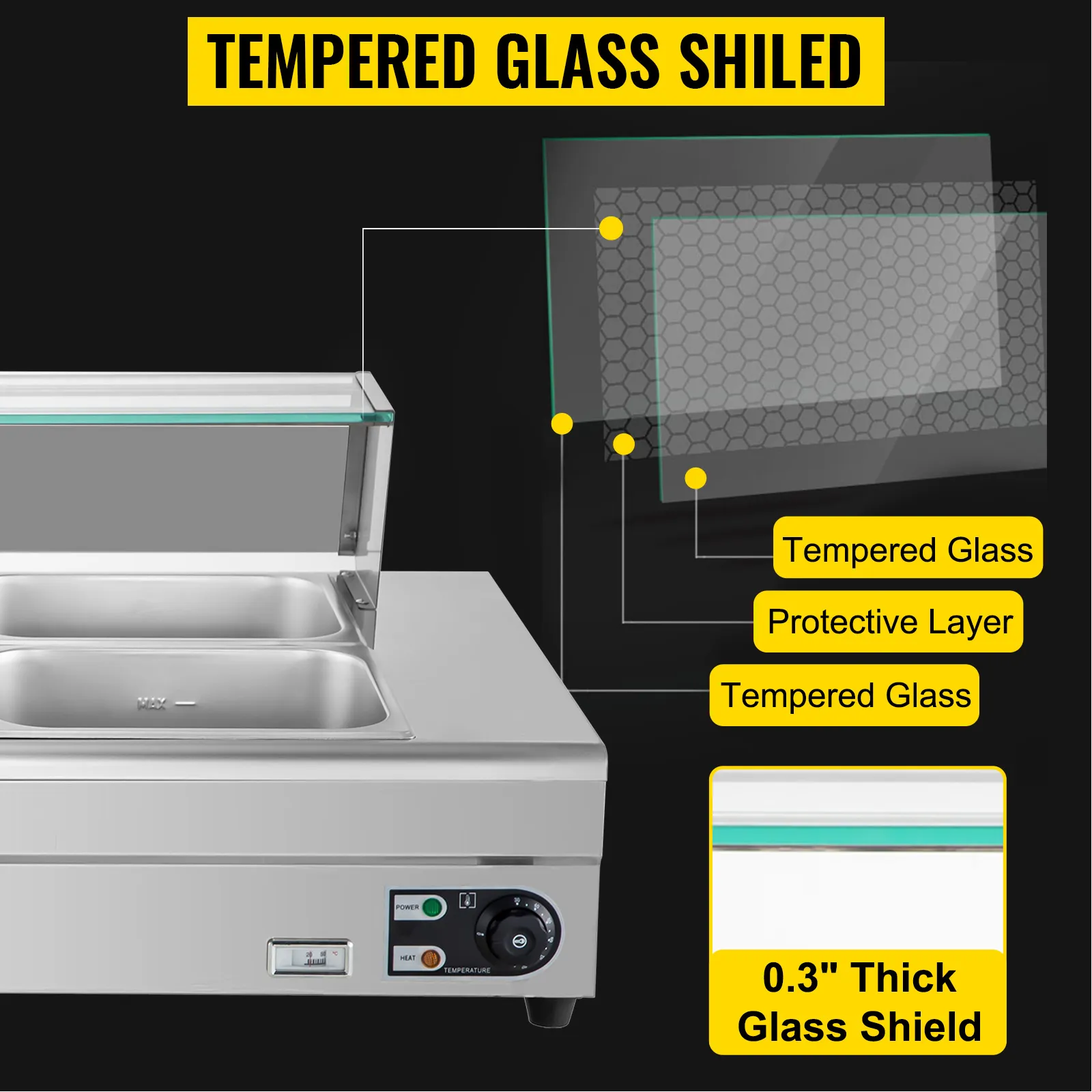 Nuestro calentador de sopa bufé viene con un escudo de vidrio templado desmontable de 8 mm de espesor. A través del escudo de vidrio, el estado de la comida se puede observar directamente, mientras se asegura la higiene de los alimentos.