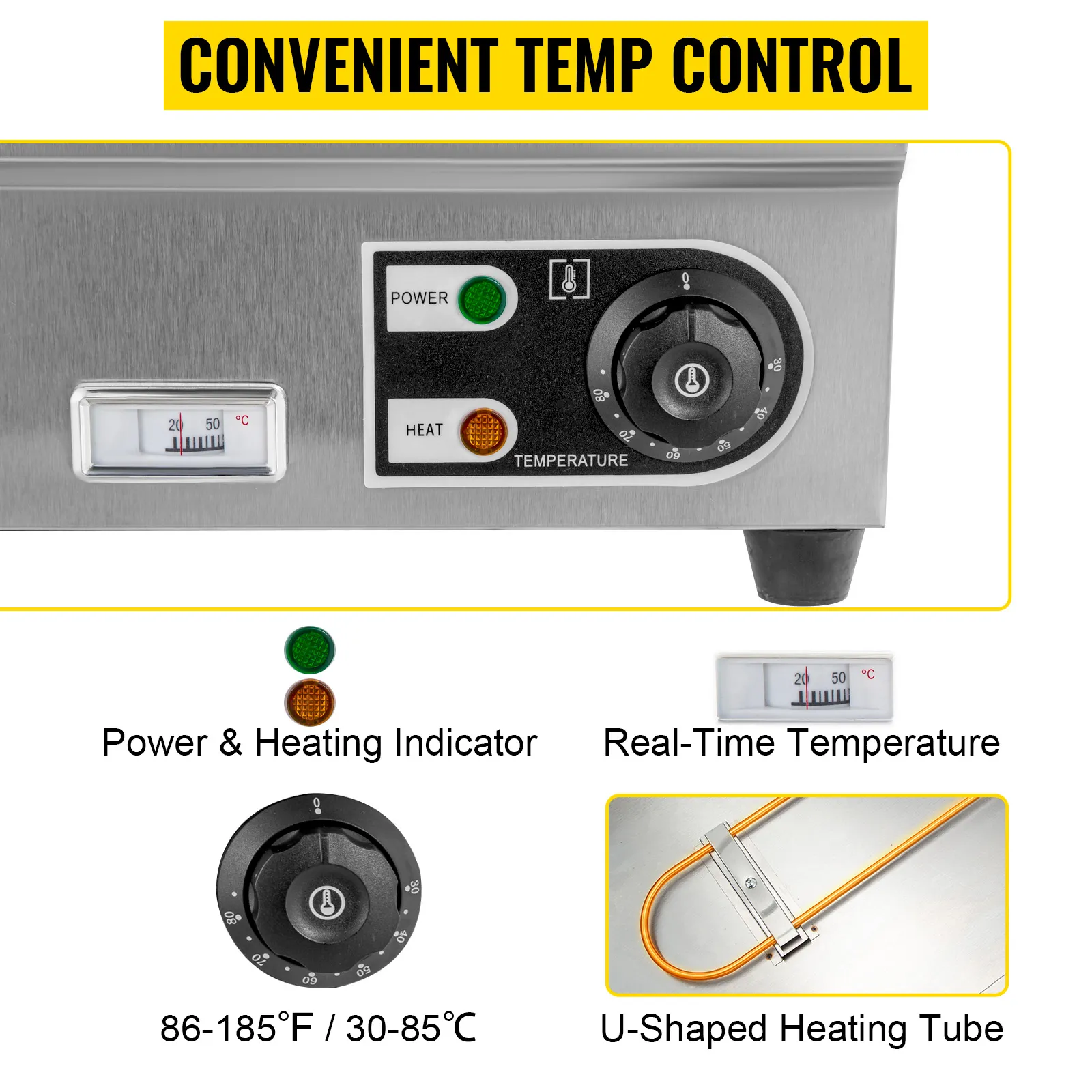Nuestro calentador de platos bufé mantiene la comida precocinada a la temperatura perfecta para comer durante largos periodos. Llene la bandeja caliente bufé con agua hasta aproximadamente 3-4 cm por encima del tubo de calentamiento y coloque las doce cacerolas removibles de acero inoxidable para alimentos en la parte superior. Ajuste la temperatura entre 30℃ y 85℃ con el botón giratorio, para mantener la comida caliente sin que se pegue, queme o se seque.