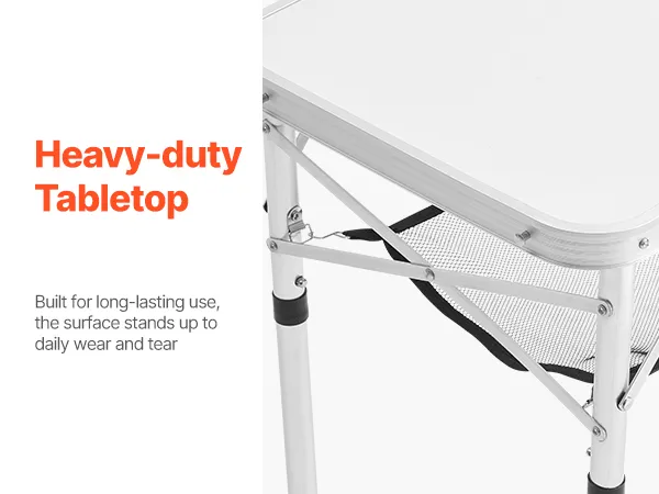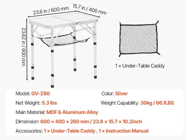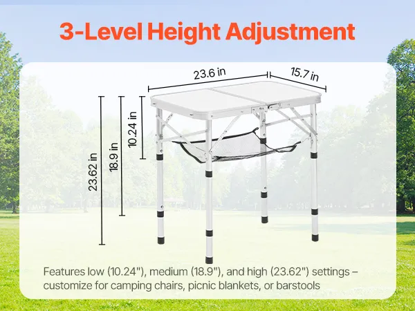 VEVOR Mesa de Camping Plegable Portátil de Altura Ajustable, de Aluminio MDF, con Malla y Asa de Transporte, Ligera y Compacta para Picnics al Aire Libre, Barbacoas, 600 x 400 x 260 mm, Plata