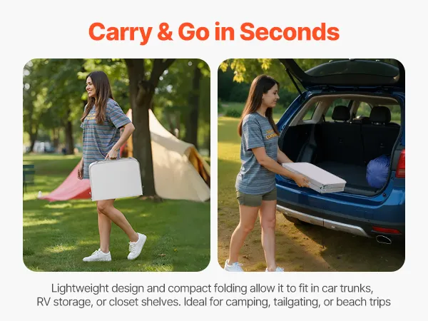 Cierre seguro y portátil: Los cierres dobles y las patas reforzadas mantienen la mesa pequeña de exterior estable, reduciendo el riesgo de caída accidental. Su diseño plegable con asa integrada facilita su transporte; cabe en el maletero del coche o en el armario