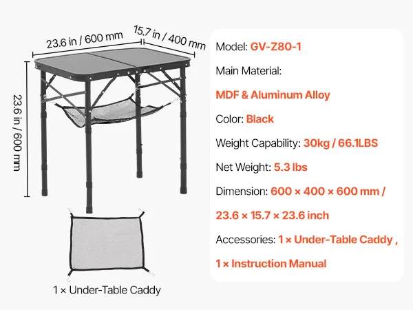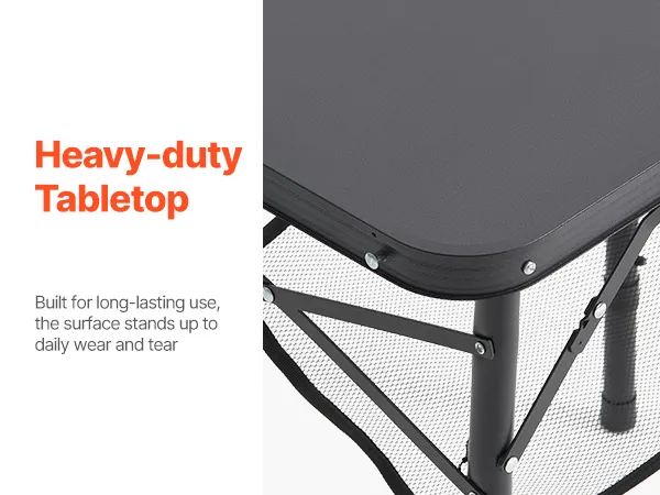 VEVOR Mesa de Camping Plegable Portátil de Altura Ajustable, de Aluminio MDF, con Malla y Asa de Transporte, Ligera y Compacta para Picnics al Aire Libre, Barbacoas, 600 x 400 x 260 mm, Negro