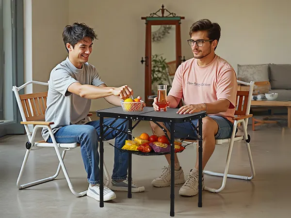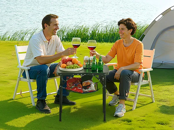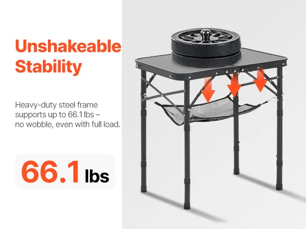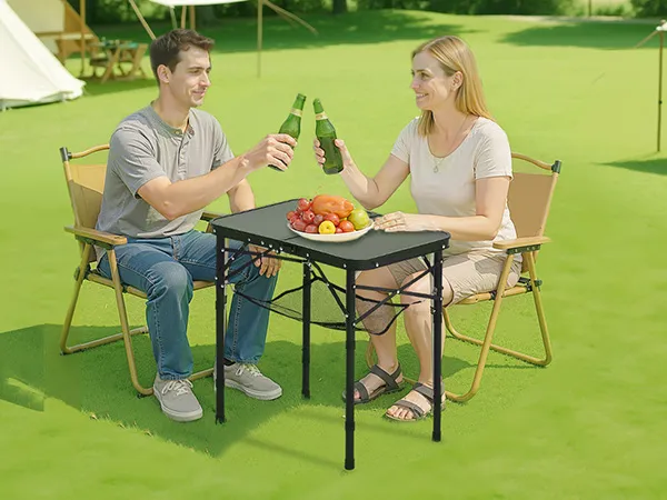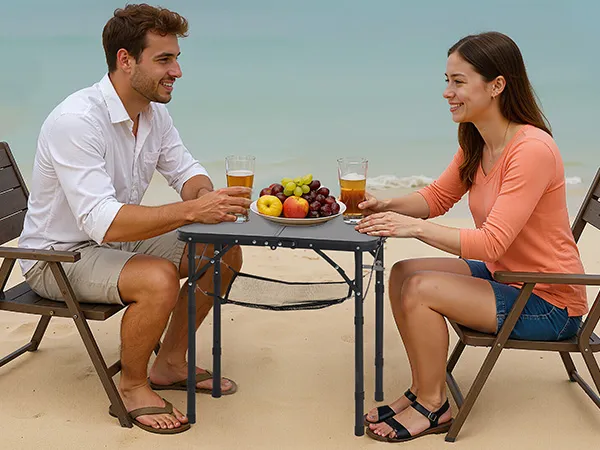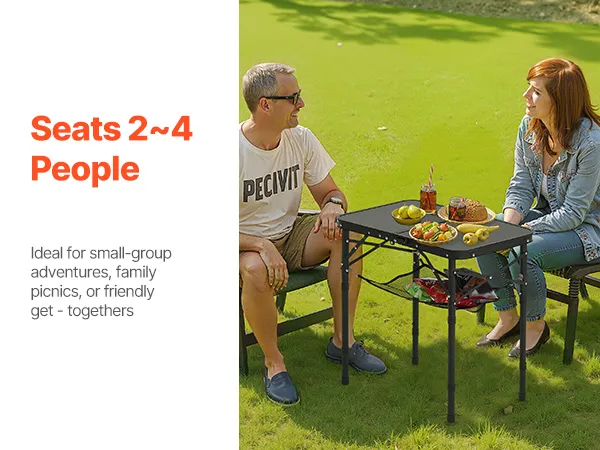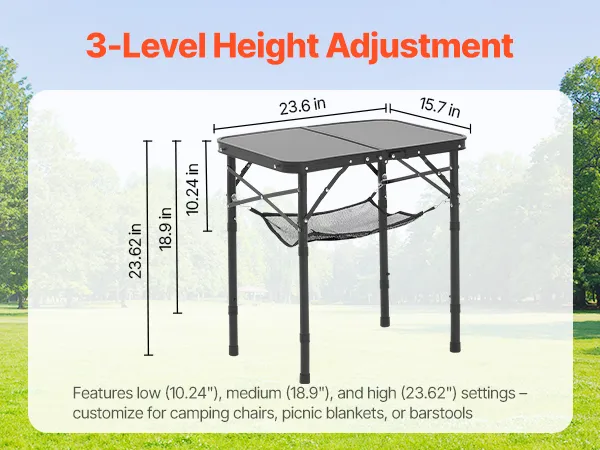 Altura de tres etapas: La mesa de camping se adapta a diversas ocasiones con ajuste de altura de tres etapas: 25.9/48/59,9 cm mediante patas ajustables. La mesa de 600 x 400 mm tiene capacidad para 2 a 4 adultos, ideal para cenas íntimas, reuniones o trabajos ligeros