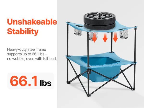 Capacidad de carga: La mesa de camping está fabricada con tela Oxford 600D resistente a desgarros. Esta mesa de trabajo compacta soporta hasta 30 kg, lo que garantiza una superficie estable para alimentos y bebidas durante las actividades al aire libre
