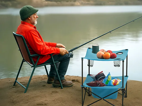 Soluciones de almacenamiento listas para la aventura: Cuenta con 4 portavasos extragrandes, una bolsa grande para utensilios, teléfonos y refrigerios, y estantes dobles de malla. La mesa auxiliar mantiene los artículos esenciales lejos del suelo y al alcance durante caminatas, pesca o conciertos
