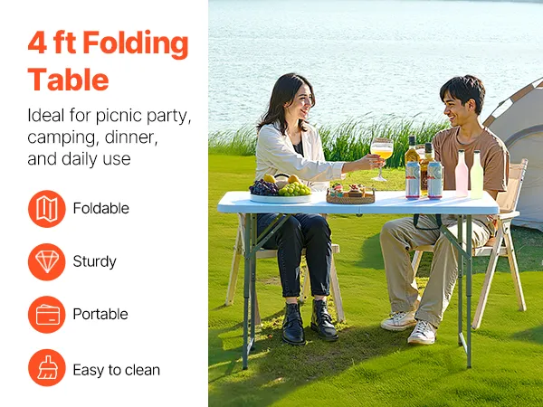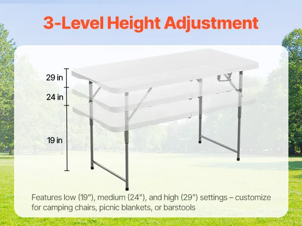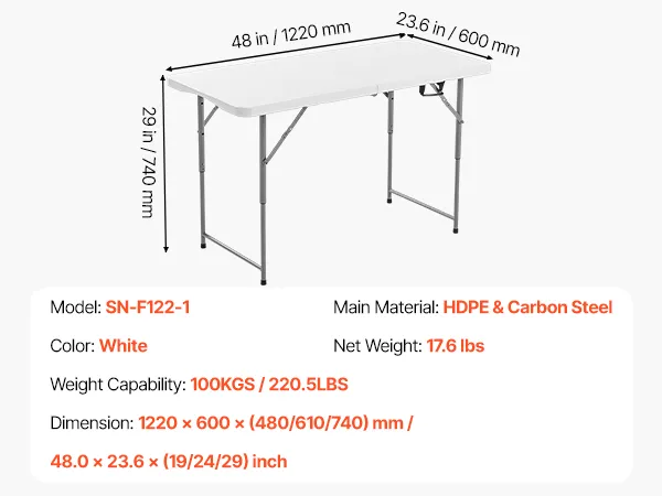 VEVOR Mesa Plegable Plástico Buffet Portátil Multiusos, Rectangular, con Altura Ajustable y Asa Integrada, para Fiestas, Picnics y Camping, Blanco, 1220 x 600 x (480/610/740) mm, a 4 a 6 Adultos