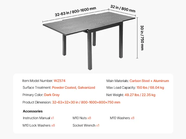 VEVOR Mesa de Terraza Extensible, Fabricada en Acero al Carbono y Aluminio, para Exterior, Terraza, Jardín, Porche, Impermeable, Capacidad de Carga 68 kg, Color Gris Oscuro, 80–160 x 80 x 75 cm