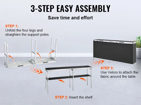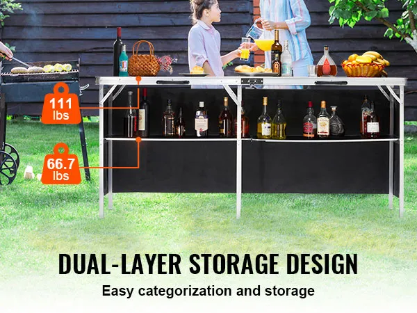 La mesa de bar portátil VEVOR con estante de almacenamiento ofrece un amplio espacio de trabajo. Su diseño extralargo proporciona mucho espacio para tus artículos. Además, incluye un estante de almacenamiento adicional. Este estante es perfecto para guardar suministros o productos adicionales. El diseño espacioso garantiza que tengas suficiente espacio para acomodar todo lo que necesitas. Por lo tanto, es ideal para eventos en los que quieras exhibir o servir varios artículos en la mesa. Además, el estante de almacenamiento adicional hace que las cosas sean más versátiles.