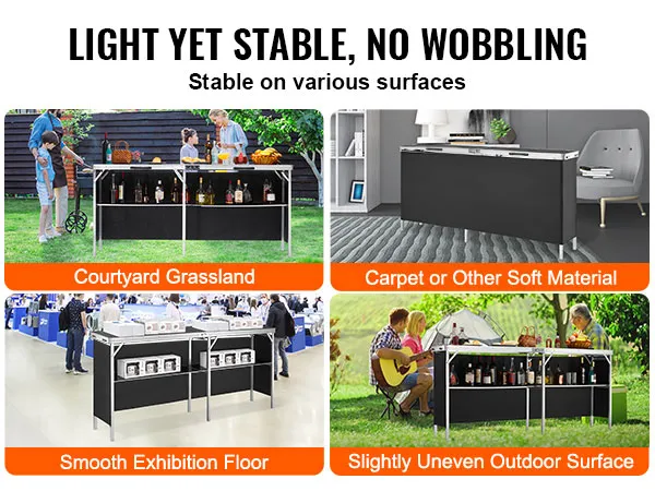 La mesa de bar portátil plegable extra larga de VEVOR es una mesa versátil. Se puede utilizar tanto para eventos en interiores como en exteriores. No importa si va a organizar eventos o una exposición, esta mesa es perfecta. Puede utilizarla en cualquier lugar, desde patios traseros hasta salas de conferencias. El diseño de la mesa garantiza que funcione bien en cualquier entorno. Esto la convierte en una opción confiable para todas las necesidades de su evento. Con su versatilidad, demuestra que es la mejor incorporación a su equipo para fiestas.